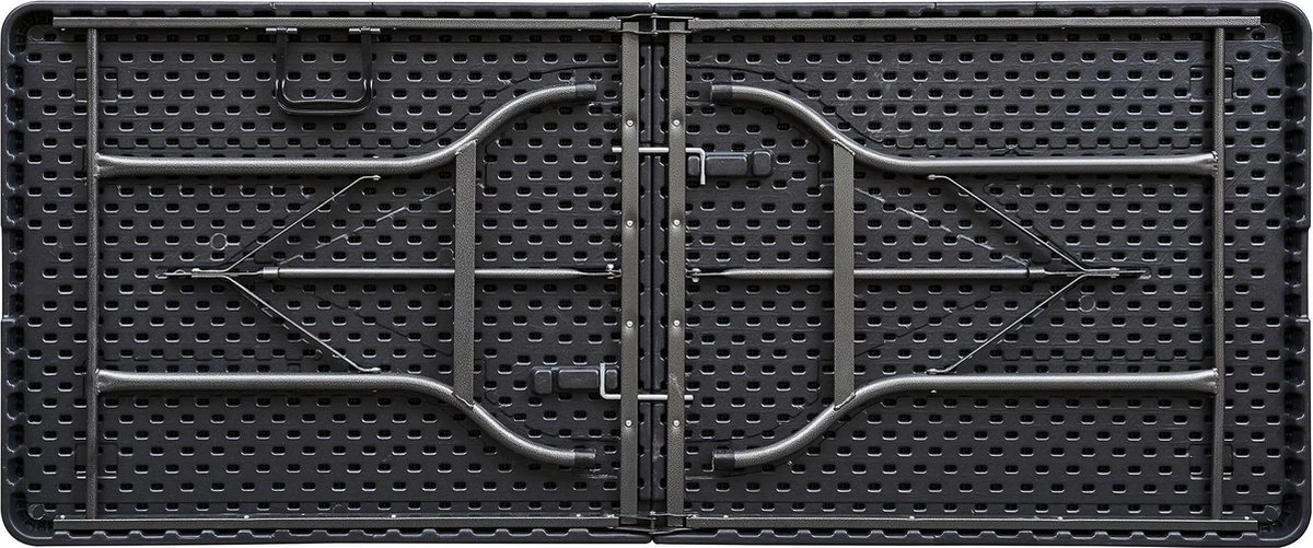 Inklapbare tafel met hout look. Op zoek naar een vouwtafel die je zowel binnen als buiten kunt gebruiken? Deze picknicktafel zwart is ideaal voor buiten, op de camping of voor het creëren van extra (zit)ruimte op feestjes. De tafel is 180cm lang, 74cm breed en 72cm hoog. Opgeklapt is de tafel slechts 90x74x9cm en dus heel compact op te bergen. Daarnaast heeft de plooitafel een handvat zodat je hem gemakkelijk mee kunt nemen.